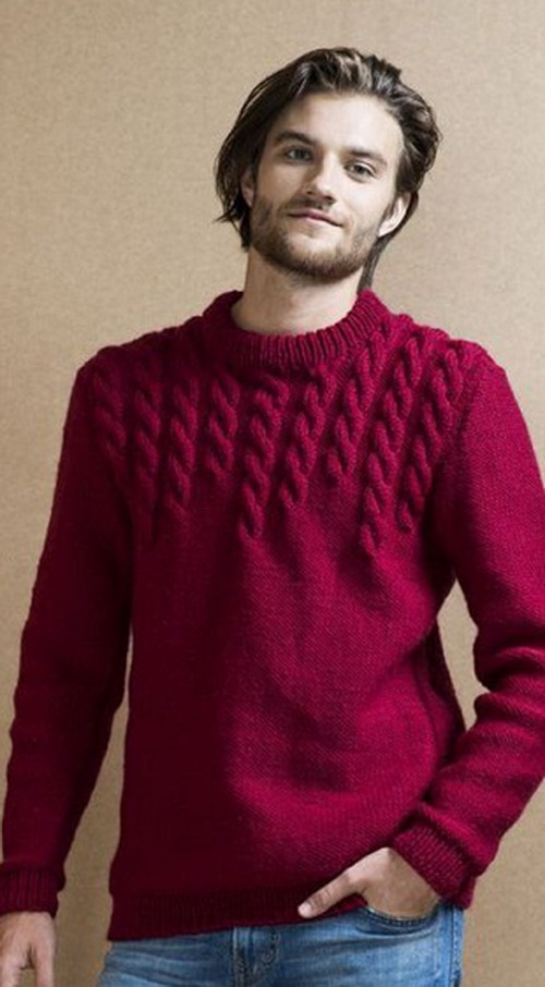 Свитер для сильной половины человечества связан спицами. Основной узор свитера - лицевая гладь. Верх свитера украшен дорожками "кос" разными по размеру. Свитер связан спицами №6 из пряжи следующего состава - 75% шерсть и 25% полиамид. Свитер связан из пряжи бордового цвета. Описание вязания свитера для мужчин приведено для следующих размеров S/M/L/XL/XXL. Манжеты рукавов, воротник и низ свитера связаны резинкой один на один. Описание вязания свитера для мужчин и схемы узоров смотрите далее.