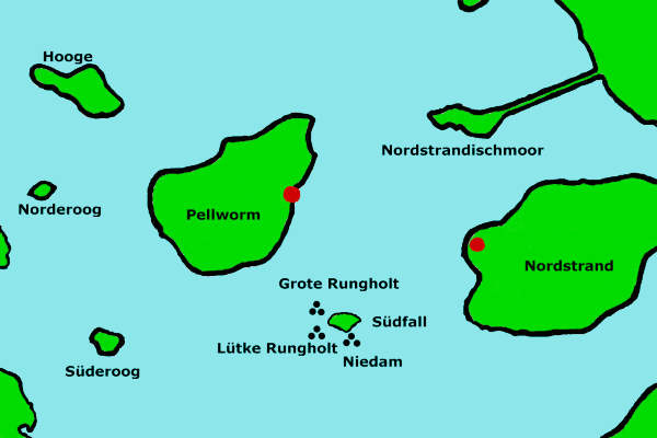 Но что же Рунгхольт? Считается, что он располагался на полуострове недалеко от нынешнего побережья Северной Фризии. Наводнение 1362 года разрезало полуостров пополам, образовав остров Странд. Попутно потоком снесло большой кусок земли, на котором стоял город Рунгхольт. Площадь острова Странд составляла порядка 220 квадратных километров, однако последующее наводнение раздробило и его, в результате чего возникли острова Пелльворм, Нордстранд (теперь снова полуостров), Нордстрандишмур и Зюдфаль.
