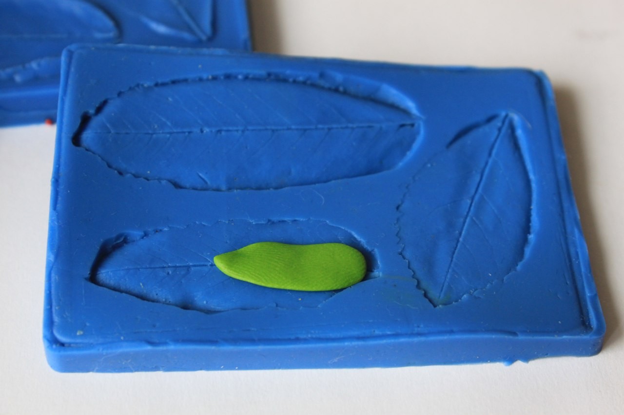 Для листочков понадобиться глина Фимо "зелёное яблоко и "зелёный лист". Смешиваем, примерно, 1:1 и формируем листочек толщиной 1 мм.размером около 2 см. Прижимаем вайнером(молд) и достаем готовый листик. Делаем их два.