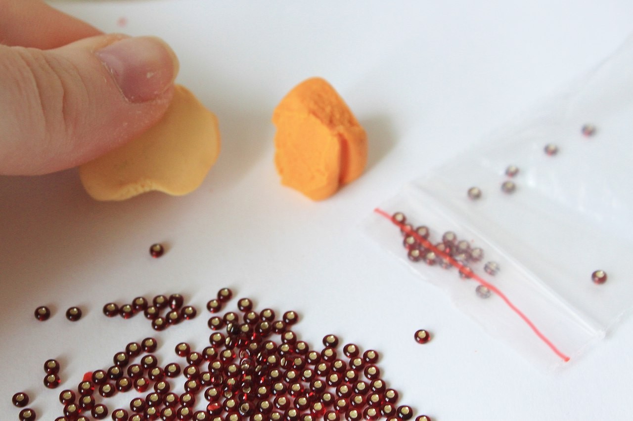 Затем, когда наше изделие запеклась, даём ему остыть(!),и только потом вынимаем фольгу. Тем временем смешиваем белую и жёлтую глину и устилаем полую часть нашего граната, и зубочисткой (да-да, главный инструмент мой) вдавливаем в нее бисер