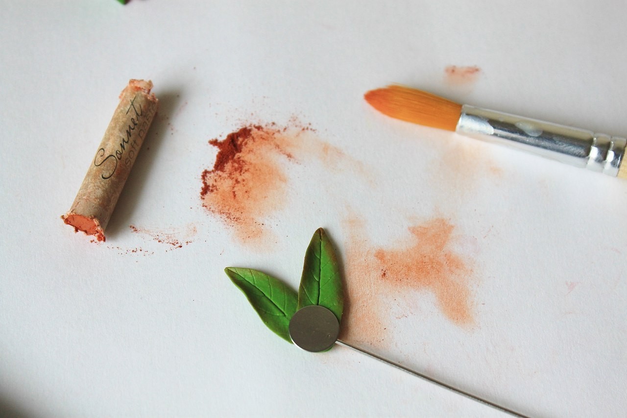 Затем берём пастель кирпичного цвета и кисточкой тонируем края, скрепляемых их между собой и применяем на брошь-иглу. Да, так и называется. В любом магазине фурнитуры есть. Запекаемой вместе 30 минут . Затем, остужаем.