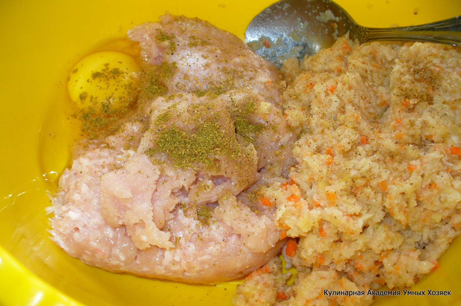 Добавьте капустно-луково-хлебную массу к куриному фаршу.