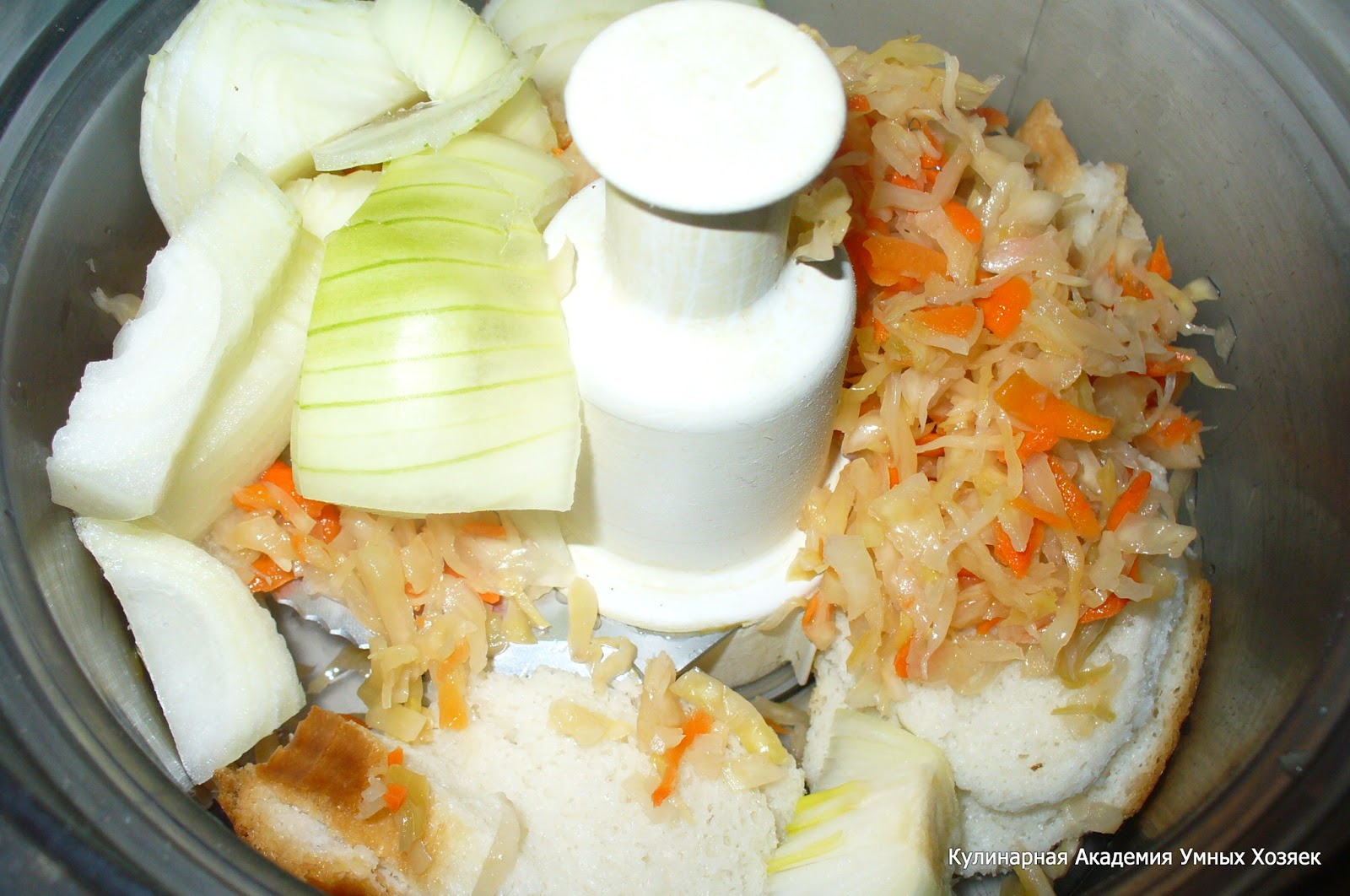 Батон замочите в молоке. Затем слегка отожмите и пропустите через мясорубку или измельчите в комбайне вместе с квашеной капустой и крупно порезанной луковицей.