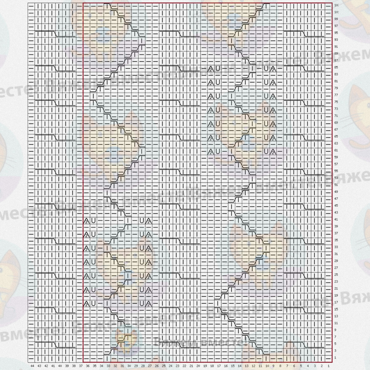 Один раппорт узора равен 36 петлям по ширине и 104 рядам по высоте. Схема составлена приблизительно, но максимально близка к оригиналу. Обратите внимание на вертикальные жгуты, перекрещивания выполняются в каждом девятом ряду.