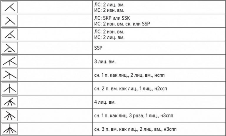 SSK (сн., сн., лиц.) — снять, снять, лицевая: провязать две лицевые вместе с наклоном влево (снять две петли за переднюю стенку на правую спицу, вернуть их на левую так, чтобы спереди были левые стенки петель, провязать петли вместе за заднюю стенку)