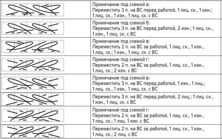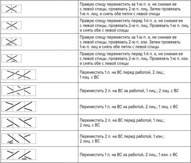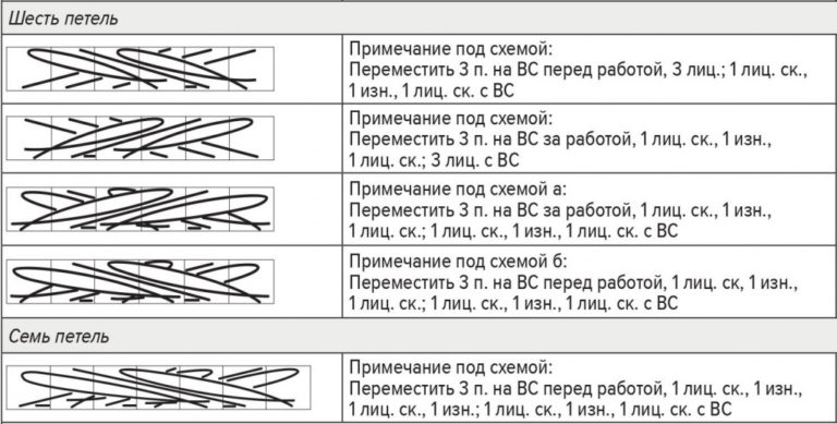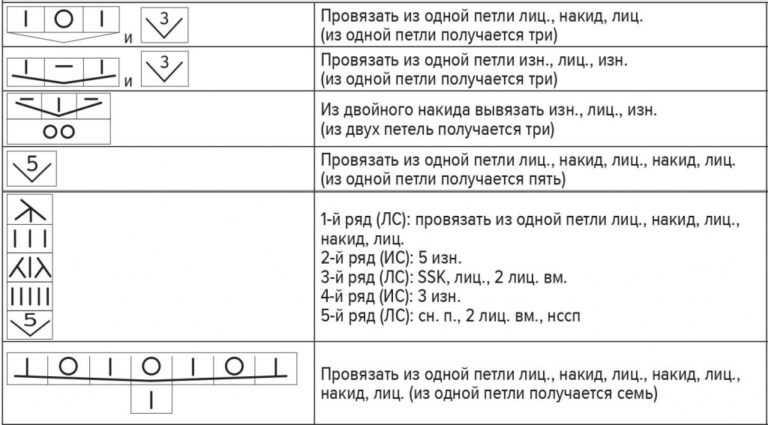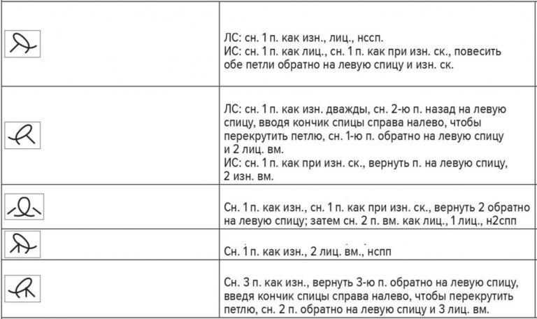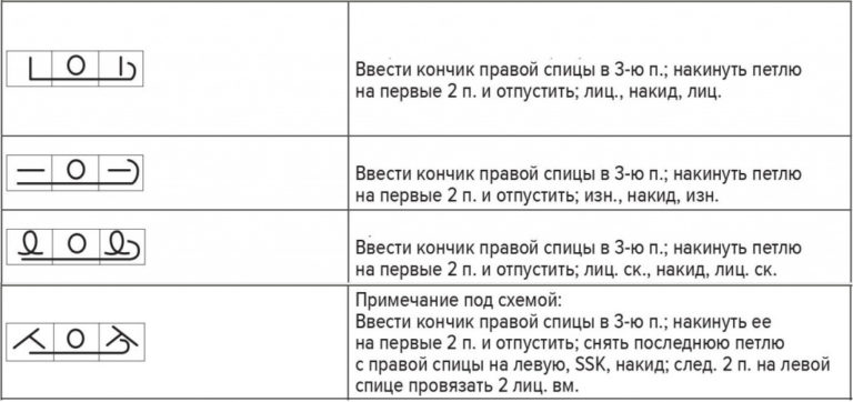 нЗспп — снять три петли, четвертую провязать лицевой, накинуть на нее снятые