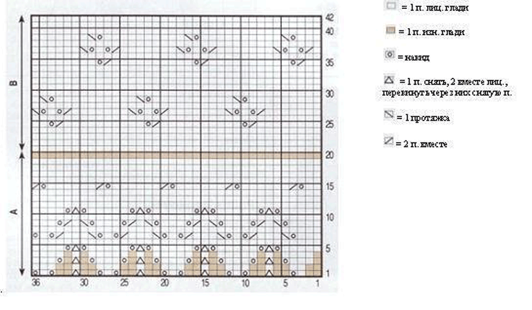 Схема вязания дана одновременно для волана - узор А (с 1-го по 20-й ряд и с 1-й по 8-ю петлю) и основной вязки - узор В (с 21-го по 42-й ряды и с 6-й по 17-ю петлю )