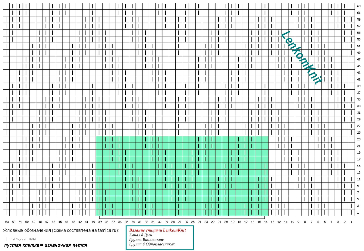 На схеме раппорт узора выделен зеленым цветом. Узор будет выглядеть одинаково, если вязать сверху вниз и снизу вверх.