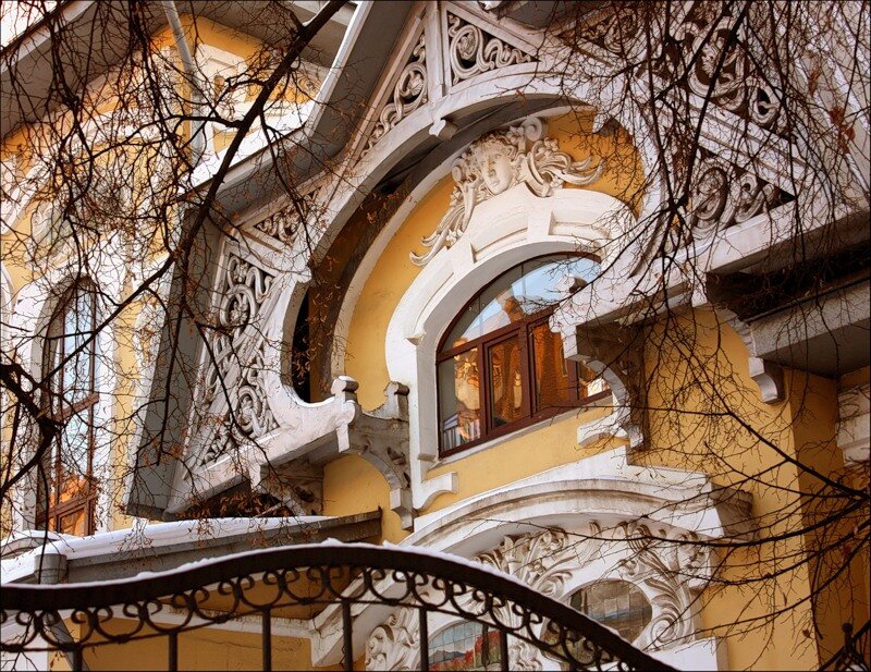 Наиболее выразительным элементом оформления особняка стали три майоликовых пейзажных панно, симметричная пара у центрального двухчастного окна и одно в верхней части башни. Помимо них фасады украшают витражи, маскароны, рельефная лепнина и ажурные узоры решёток. Архитектор также создал выразительные интерьеры: в отделке использовали мрамор и ценную древесину, были установлены резные филёнчатые двери, потолки и стены украшены кессонами.