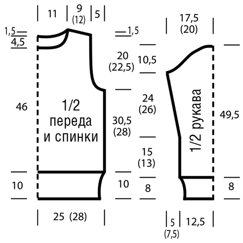 Через 39 см = 90 рядов от планки закрыть для оката рукава с обеих сторон 1 x 3 п., затем в каждом 2-м ряду 11 x 2 п. (1 x 3 п., 8 x 2 п. и 2 x 3 п.). Оставшиеся 8 (10) п. закрыть через 49,5 см = 114 рядов от планки.
