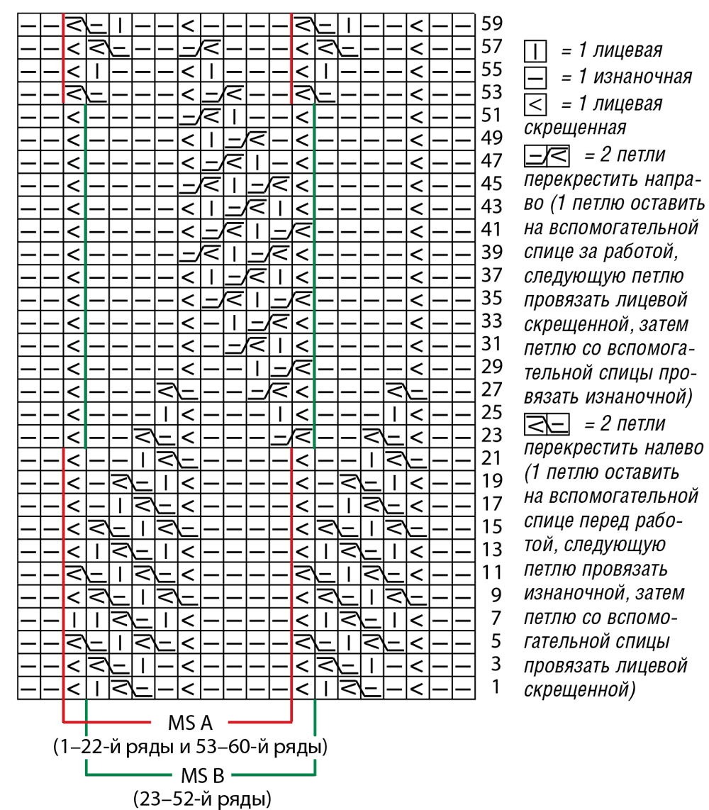 Рельефный узор: вязать спицами №5 по схеме, на которой даны лицевые ряды. Число петель кратно 10 + 2 кромочные п. В изнаночных рядах петли провязывать по рисунку, лицевые скрещенные п. провязывать изнаночными. Начать с 1 кромочной п. и петель перед раппортом A или B, повторять раппорт A или B, закончить петлями после раппорта A или B и 1 кромочной п. Повторять 1–60-й ряды, при этом следить за тем, чтобы раппорт в 23-м ряду и в 53-м ряду смещался на 1 петлю.