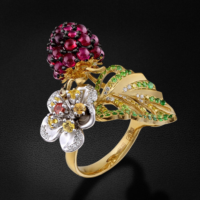 Кольцо "Малина" с рубинами, сапфирами, бриллиантами, демантоидами, тсаворитами из комбинированного золота 750 пробы. Master Exclusive Jewellery