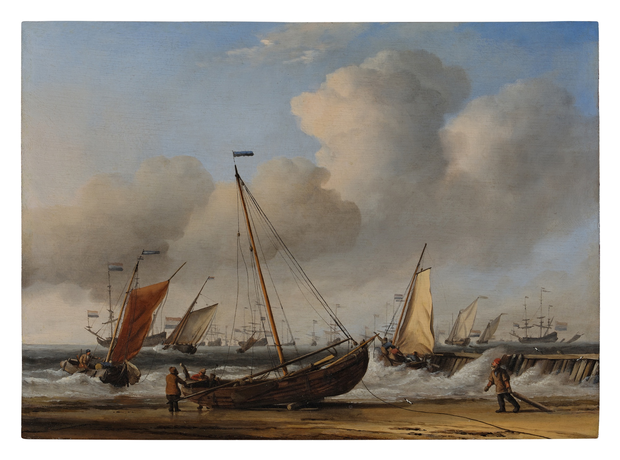A fishing pink hauled up on the beach and other vessels under sail in a fresh breeze off the Dutch coast