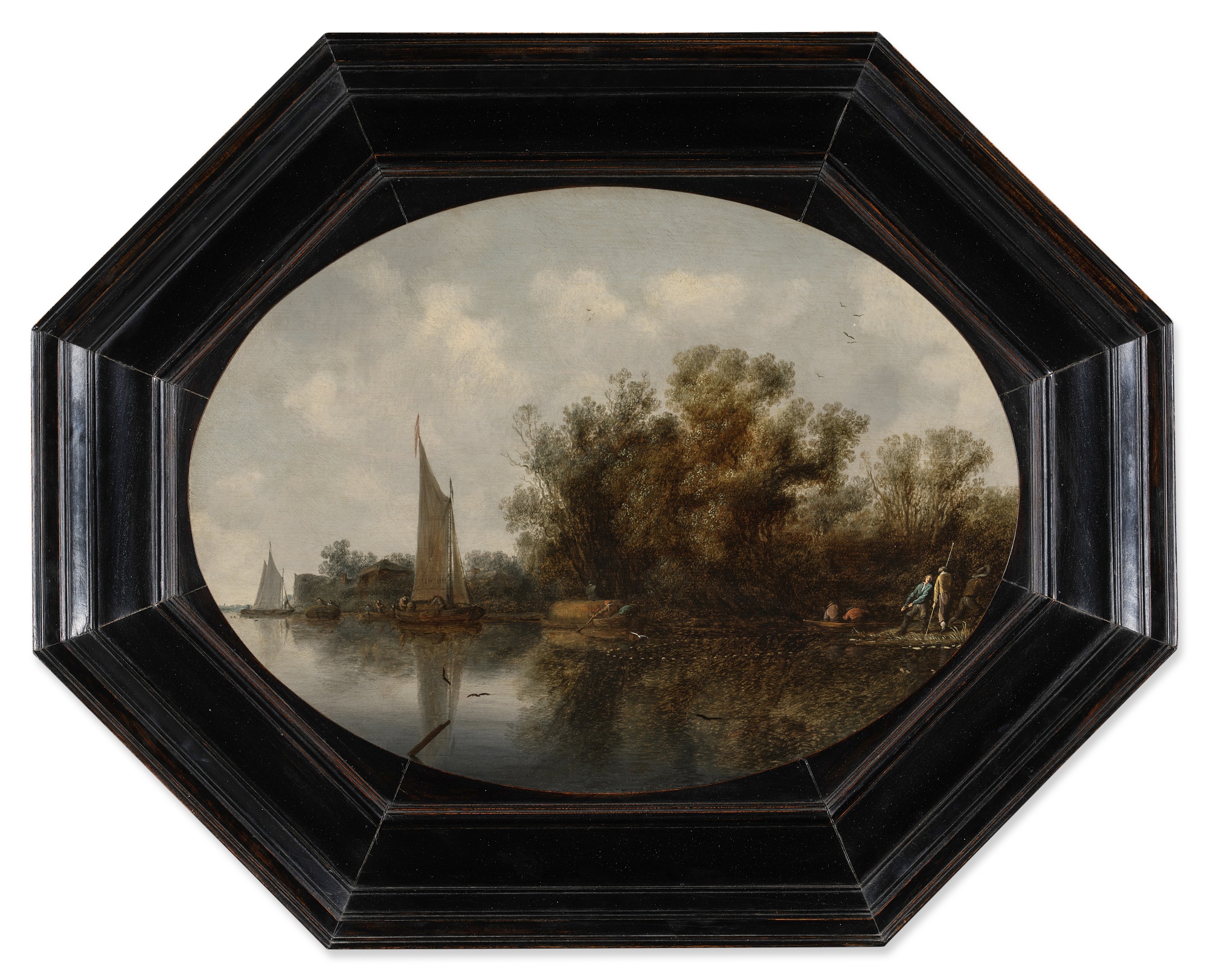 A river landscape with a sailboat at left, three fishermen casting their nets at right, and other boats and figures;