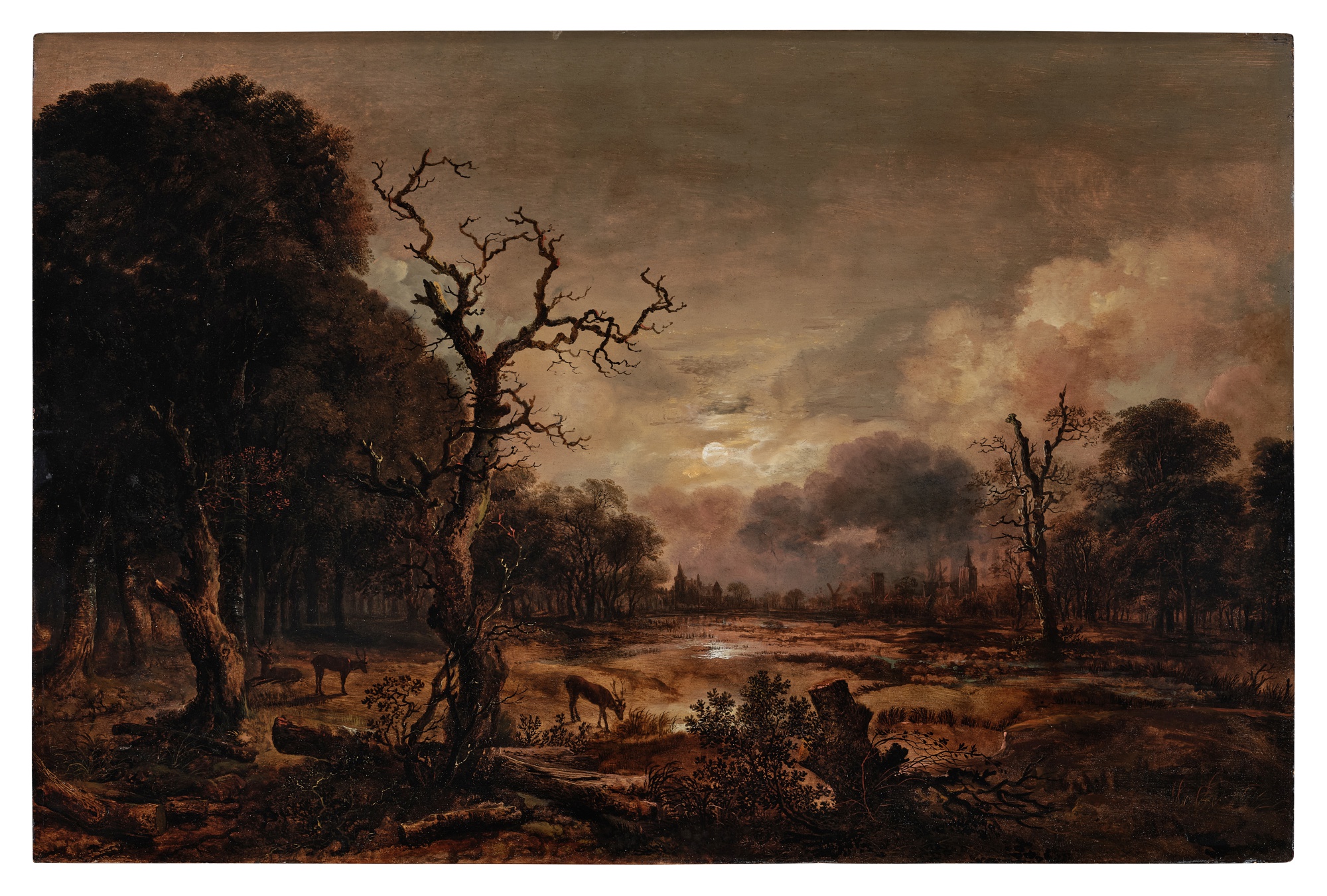 A marshy forest landscape at moonlight, with stags at left and a view of a town beyond
