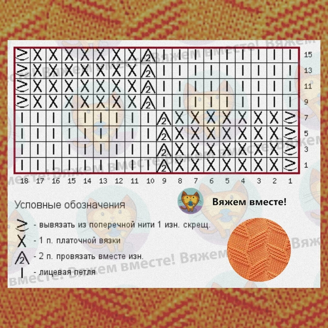 Узор подойдёт для внимательных новичков, но учтите, что кроме вывязывания лицевых и изнаночных петель узор предполагает прибавление изнаночных петель из протяжки и выполнение симметричных им убавлений. Подробнее смотрите схему.