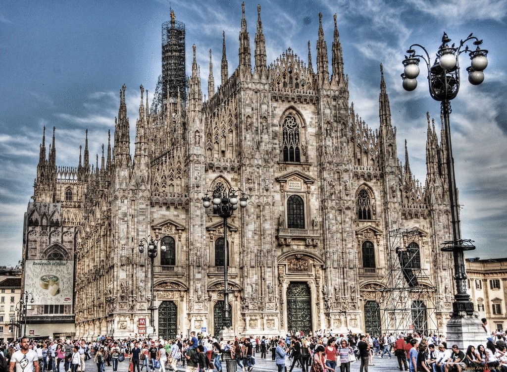 Грандиозный и тщательно спроектированный готический собор на главной площади Милана, Дуомо ди Милано— одно из самых известных зданий в Европе. Это один из самых больших готических, и второй по величине католический собор в мире построен из белого мрамора. Миланский соборстроился на протяжении почти 4 столетий. Первый камень был заложен в в 1386 году. И лишь в 1762 году собор был завершен установкой важнейшей достопримечательности 104-метрового шпиля со статуей Мадонны из позолоченной бронзы. Здание стоит в самом центре Милана и является его символом. Позднее был издан декрет о том, что ни одно здание Милана не должно заслонять собой святую покровительницу города.