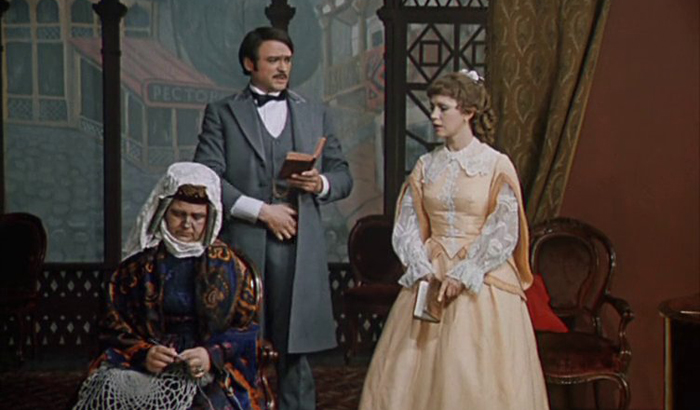 [показать]Русский текст и стихи В.Константинова и Б.Рацера. Экранизация одноименного спектакля Ленинградского АБДТ им.Горького, поставленного по комедии А. Цагарели. Полная искрометного юмора телеверсия спектакля, поставленного Георгием Товстоноговым на основе одноименного классического водевиля Авксентия Цагарели. Тифлис (ныне Тбилиси), конец 19-ого столетия. Когда молодым девушкам и любого возраста мужчинам приходит пора вступить в брак, известные и уважаемые семьи, как водится, не пускают такое важное дело на самотек и обращаются к профессиональной помощи свах с достойной репутацией. В Тифлисе этим бизнесом промышляют две знаменитые свахи – Ханума и Кабато. Целью каждой из них является создание брака с максимальной пользой для обеих сторон. Являясь ярыми соперницами, свахи стараются делить области своих интересов, однако наступает момент, когда им придется сразиться друг с другом, и результат этой интеллектуальной схватки может оказаться абсолютно непредсказуемым...