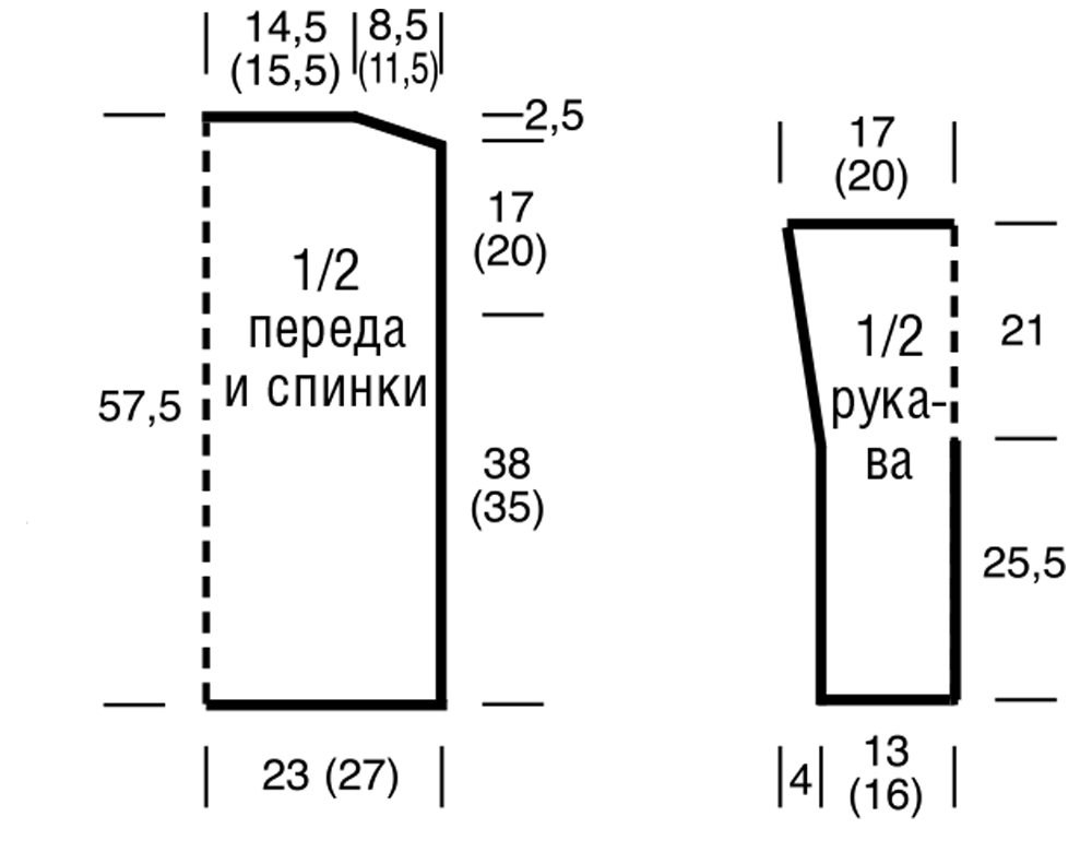 Через 57,5 см = 138 рядов от начального ряда закрыть оставшиеся 81 (89) п., при этом средние 71 (75) п. образуют горловину, внешние по 5 (7) п. — плечи.