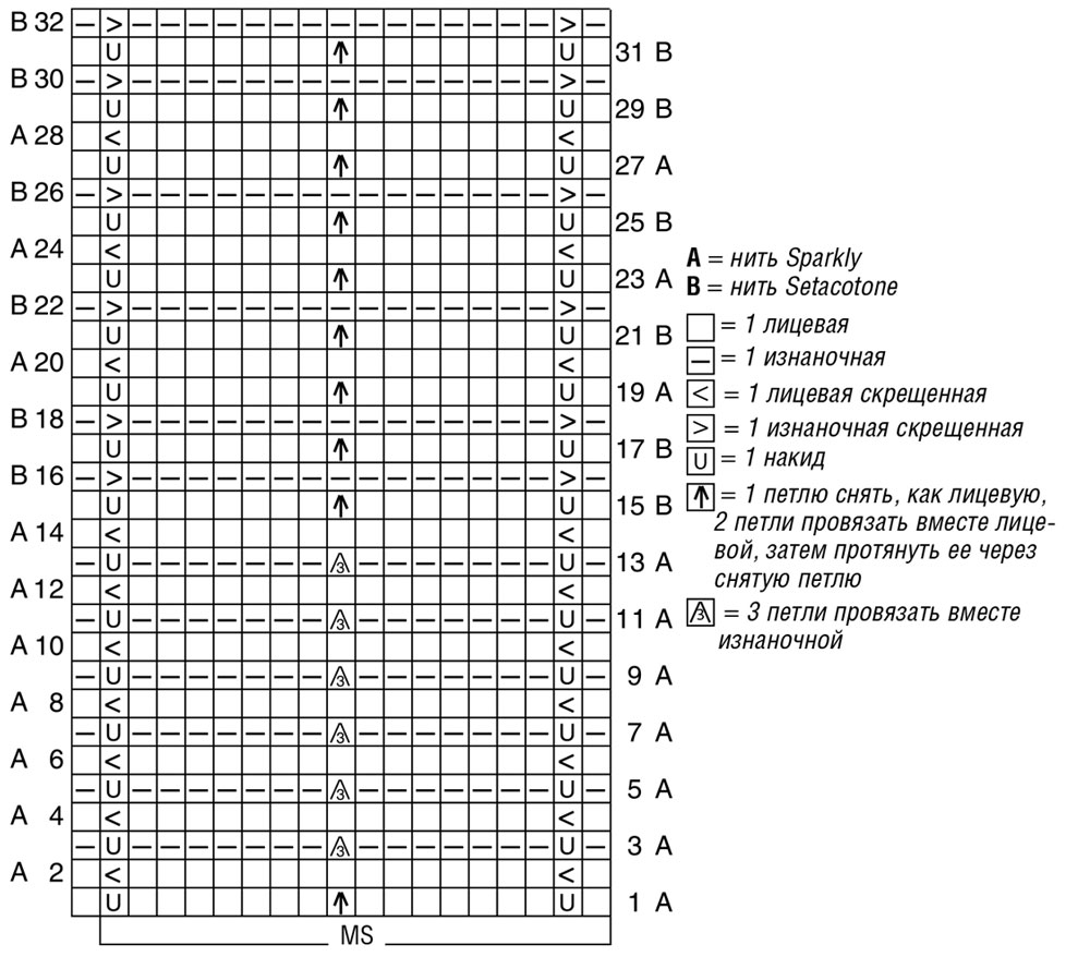 Число петель кратно 18 + 1 + 2 кромочные = вязать согл. схеме. На ней даны лицевые и изнаночные ряды. Начать с 1 кромочной, раппорт постоянно повторять, закончить петлей после раппорта и 1 кромочной. Постоянно повторять 1—32-й ряды, соблюдая указания нитей.