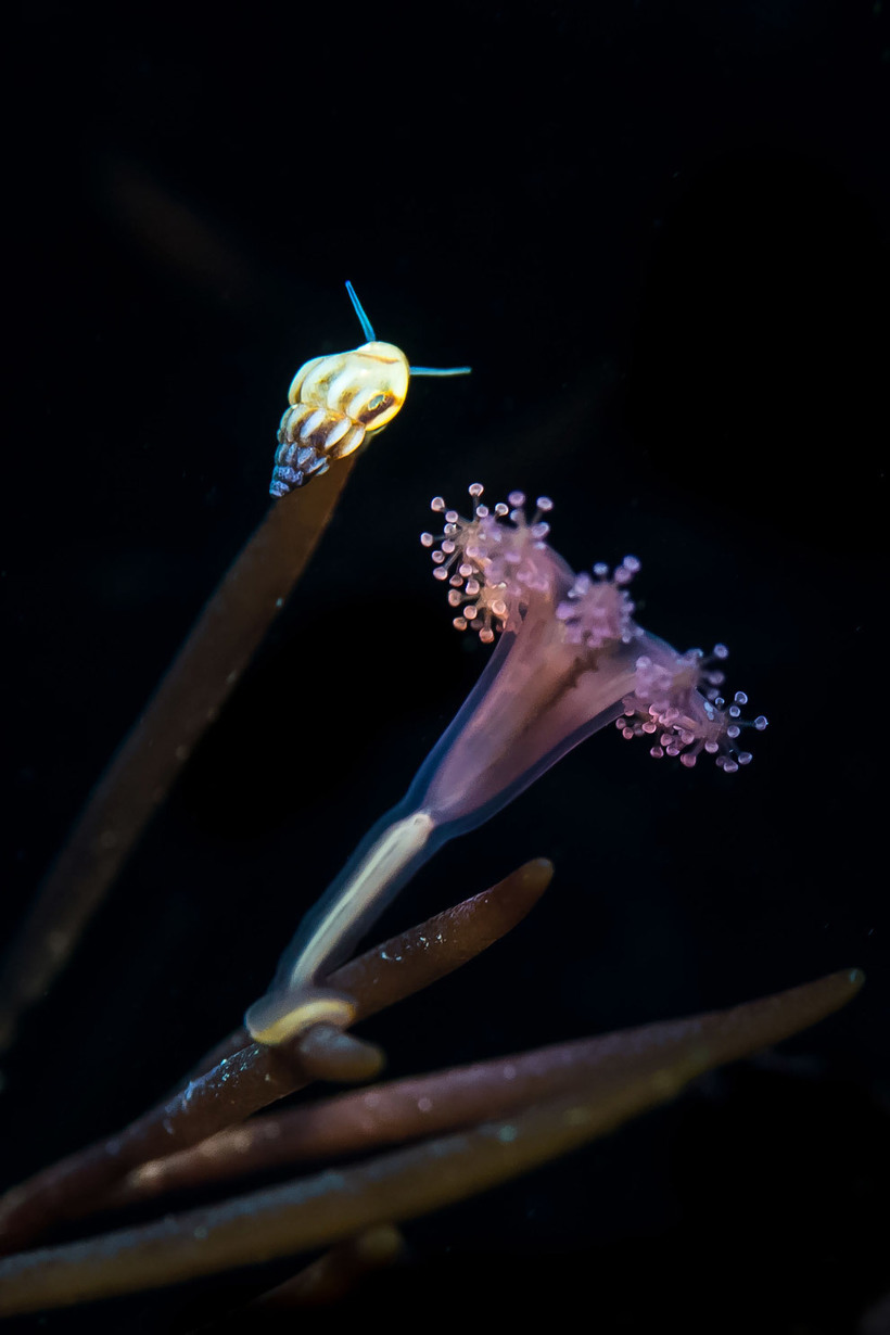 Подводная жизнь обитателей манит своей неизвестностью. Снимок медузы и улитки, от которого так и веет загадочностью.