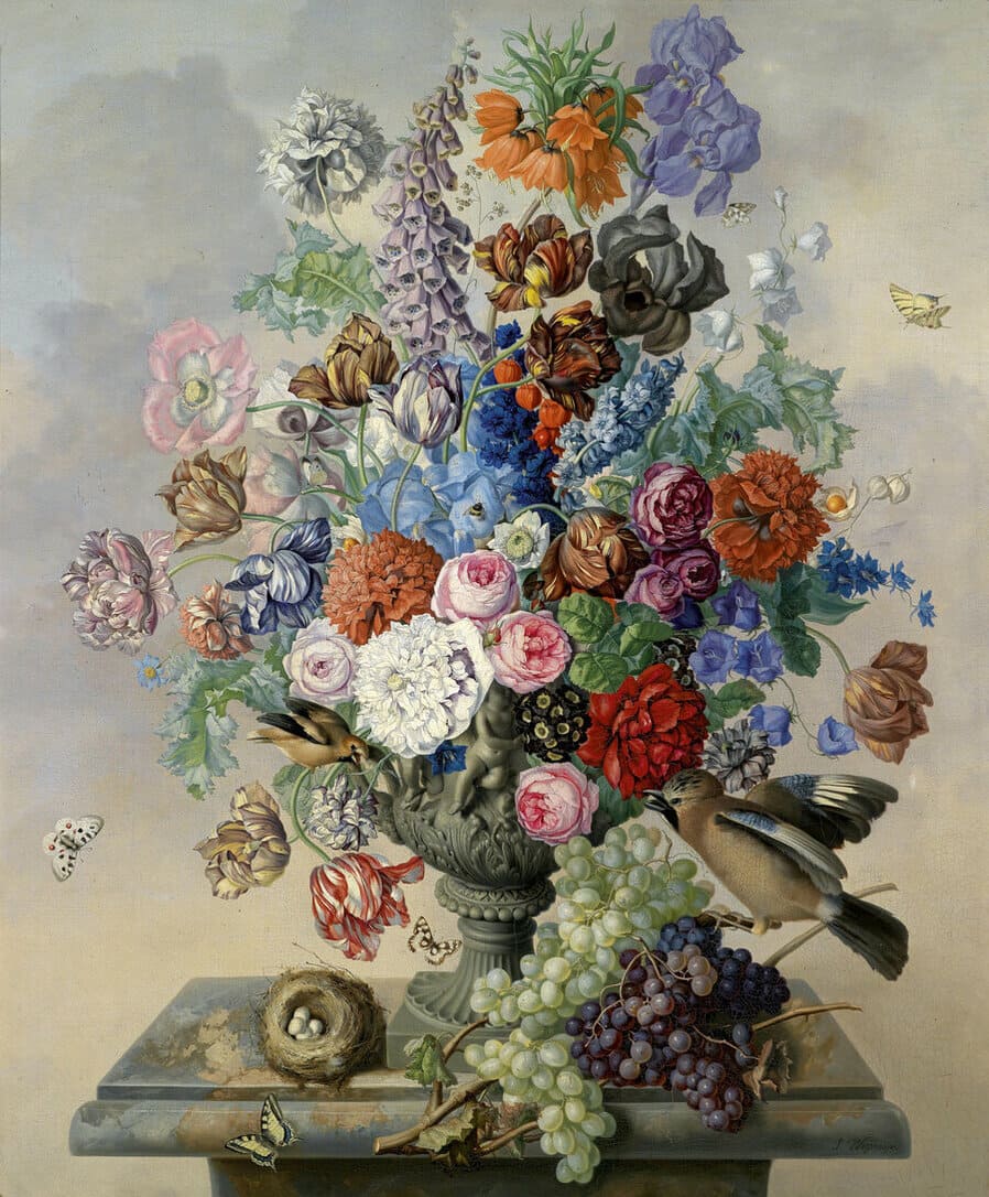 "Большой букет цветов с птичьим гнездом, бабочками и виноградом"