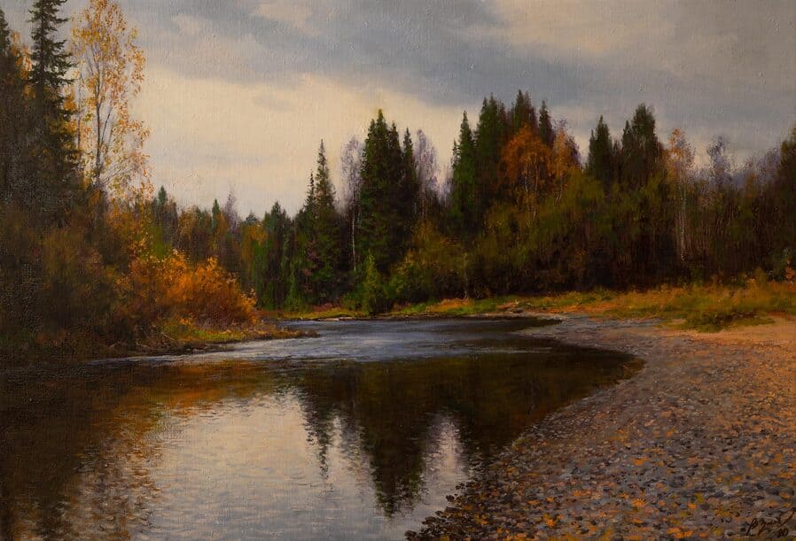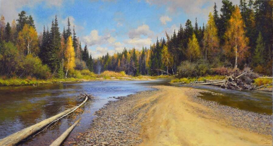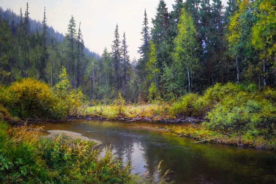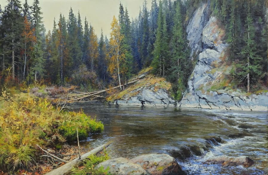 Ведь это природа Среднего Урала. На вопрос, не хотелось ли сменить формат и картины "за окном" и выехать на пленэр куда-нибудь в центральную Европу или юго — восточную Азию, художник тихо сказал, что ещё не всё на Урале охватил и ему ближе уральские пейзажи, которые являются основными темами его картин.