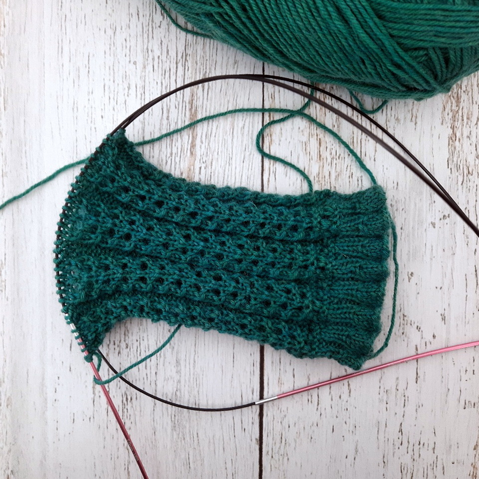 Связан ажурным узором по схеме 3 (так же, как и верхняя часть стопы и стенка пятки). В моем варианте – 14 раппортов узора или 56 рядов.