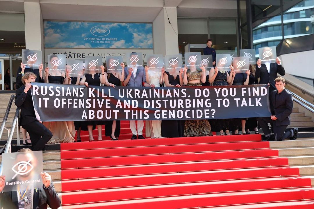 Одновременно с этим визуальным знаком члены команда фильма "Видение бабочки" развернули транспарант с надписью: Russians Kill Ukrainians. "Do you find it offensive and disturbing to talk about this genocide?" ("Россияне убивают украинцев. Вы считаете, что говорить об этом геноциде — это потенциально неприемлемый контент?").