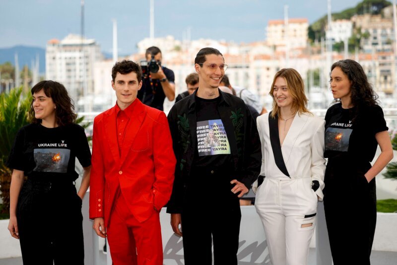 Максим Наконечный, режиссер фильма, надел на фотоколл футболку с требованием освободить Тайру "Free Tayra" ("Освободите Тайру") — украинского парамедика Юлию Паевскую, которую российские оккупанты захватили в плен в начале марта в Мариуполе.