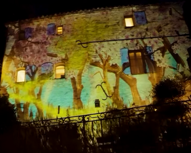 На каждом повороте — новая сцена: маленькая вывеска кафе отражает огни, фонари переливаются, словно живые факелы, а старые стены превращаются в экран, где оживают танцующие тени оливковых деревьев и виноградников, движения света напоминают шёпот ветра по полю.