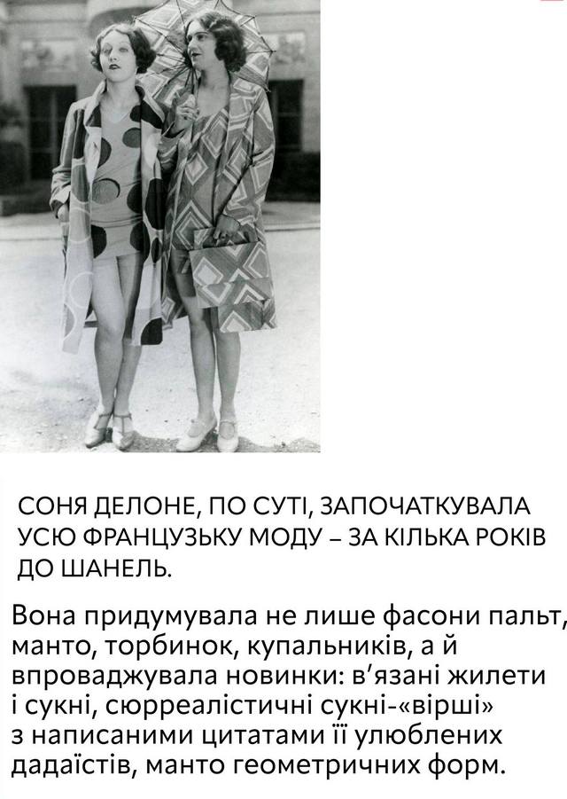 Саме Соня Делоне була законодавицею моди 1930-40-х років і основоположницею принтів, абстракцій, аплікацій на одязі. Вона придумувала не лише фасони пальт, манто, торбинок, купальників, а й впроваджувала новинки: в’язані жилети і сукні, сюрреалістичні сукні-«вірші» з написаними цитатами її улюблених дадаїстів, манто геометричних форм.