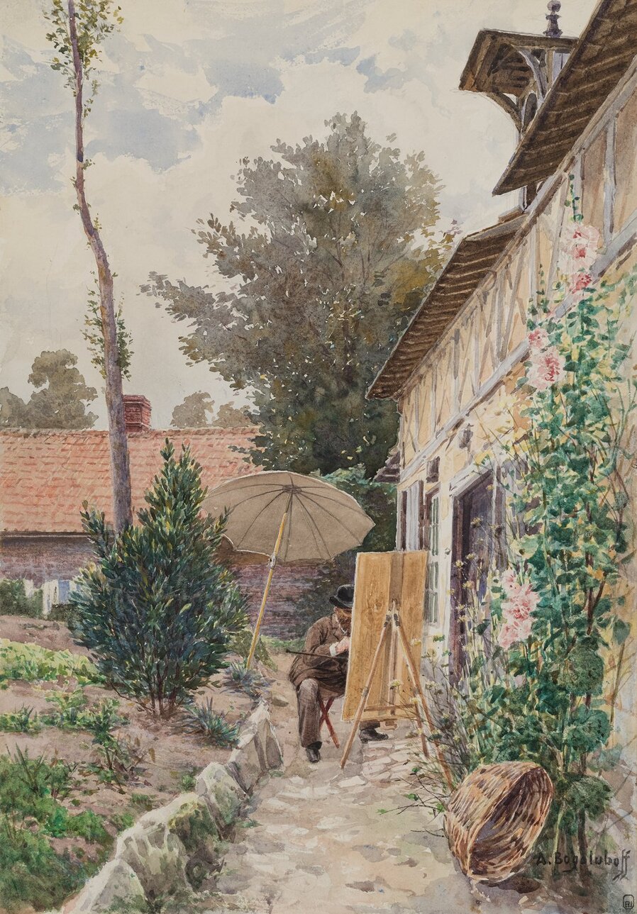 Здесь можно было обменяться вестями с Родины, поговорить о новостях искусства, попросить о помощи и просто посидеть возле уютно пыхтящего самовара. Боголюбов помогает советом, вывозит на натуру, обеспечивает заказы молодым художникам.