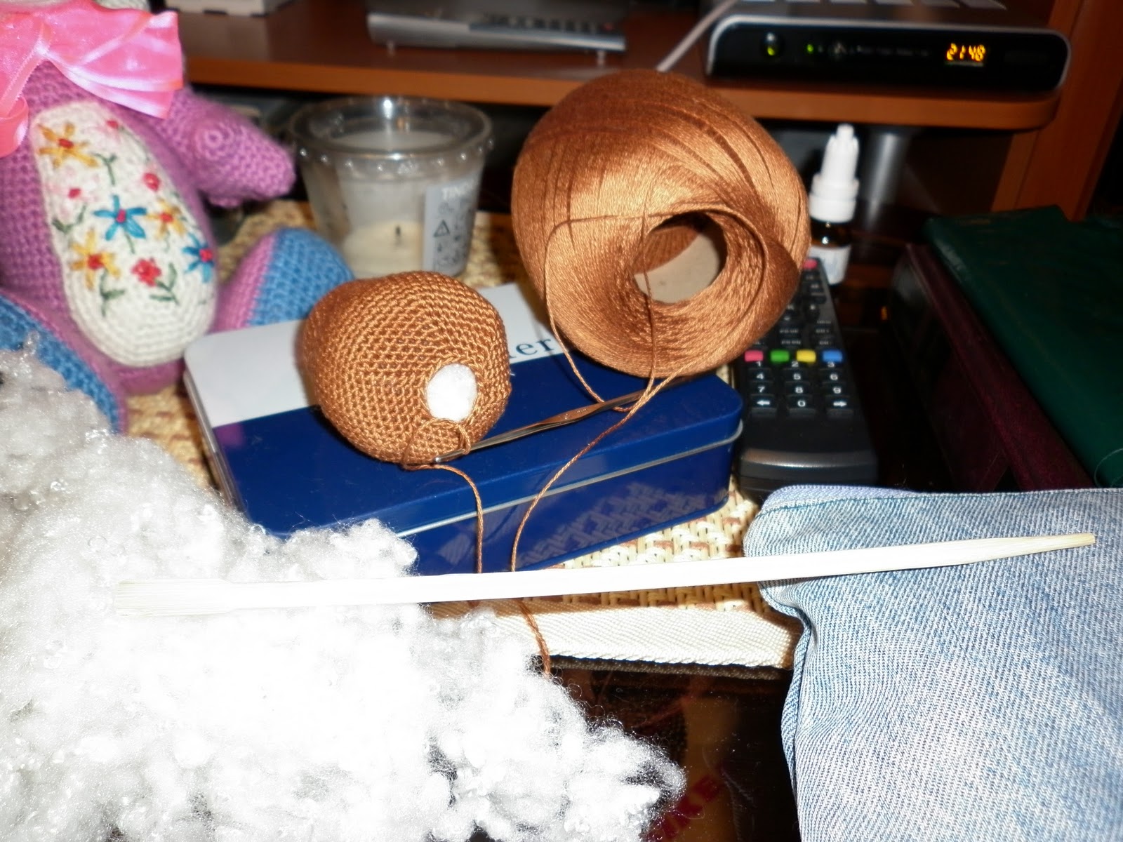 Чтобы записать схему, начинаю вязать еще одного. Попробую х/б нитки - для тела "Лотос", для лапок и ушей "Нежность" Семеновской фабрики. Крючок 1,3 мм.
