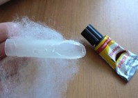 и срезаем его наискосок, эта скошенная часть потом будет обращена к голове. С помощью клея «Момент-кристалл» обклеиваем цилиндрик синтепоном, для мягкости: