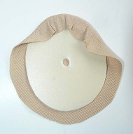 Из жесткого пластика вырезаем кружочки для низа туловища, ног и рук. Делаем в центре пластиковых кружков отверстия шилом. Раскладываем их на такие же кружки, но из ткани. Вставляем клеевой стержень в пистолет, включаем его в розетку и ждём, когда клей растопится. Приклеиваем к пластиковым кружкам только припуски на тканевых кружках (чтобы лицевая сторона была аккуратной).