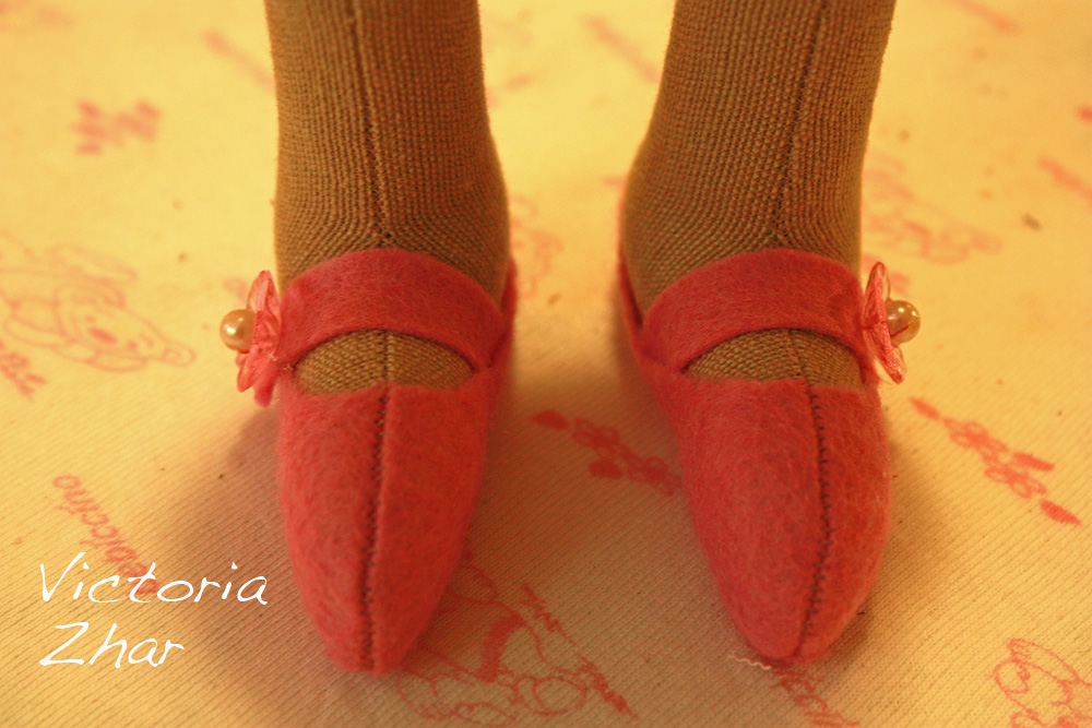 затем эти полосочки пришиваем или приклеиваем. внутреннюю часть я предпочитаю приклеивать, так как заправляю внутрь туфли. если начать ковыряться там иголкой, то фетр по краю скорее всего растянется и будет выглядеть неряшливо. а с внешней стороны можно без проблем пришить, но и тут я частенько приклеиваю. раз клей уже достала, то почему б не сделать пару лишних капель :)
