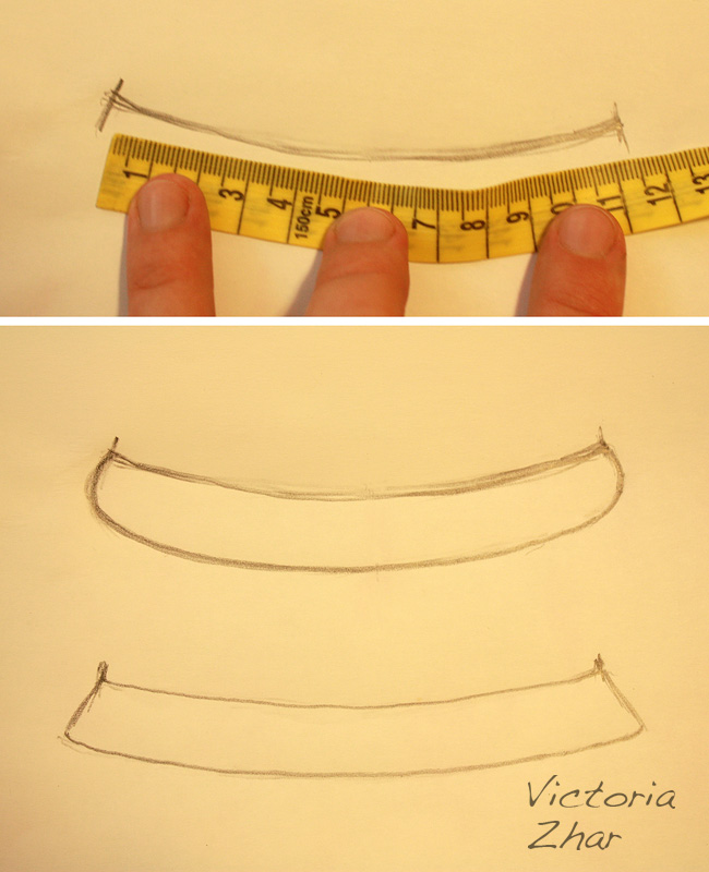 далее переводим выкройку на ткань. есть такой нюанс, что длинную ровную сторону надо прикладывать к сгибу ткани, сложенной вдвое. вот так