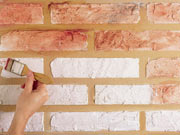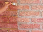 Passe o selador sobre toda a superfície, incluindo os tijolos já pintados. Com um pincel, pinte as juntas com uma mistura de tinta látex branca com uma pequena quantidade de verde cimento e de preto. Acrescente um pouco de areia a essa preparação. Deixe as manchas de pintura que ficaram nos tijolos. Passe o pano sobre os tijolos para espalhar a tinta. Assim, você suavizará os tons. Deixe secar.