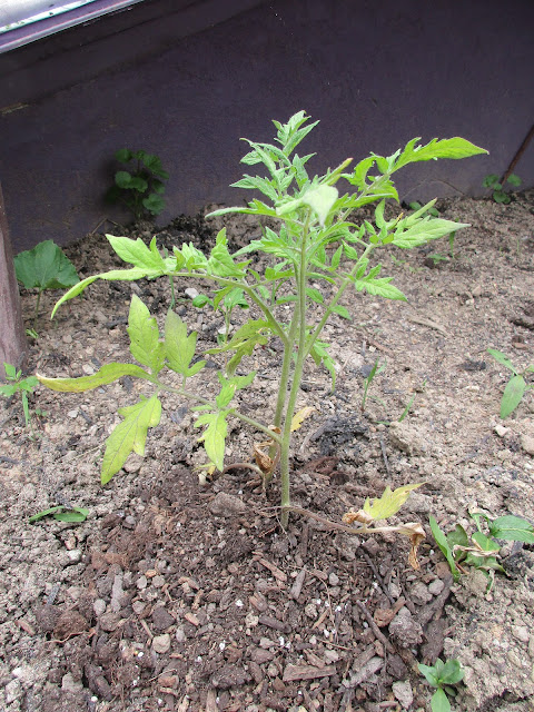 После 15 мая мы высадили на огород, тонкие заморыши помидорной рассады, которые передержали лишних 7-10 дней из-за холодной погоды.