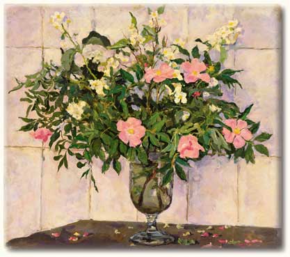 Примечание Подпись латиницей внизу справа. Работа была перетянута, и оригинальные надписи на обороте были скопированы другой рукой: «П. Кончаловский, 1918, Цветы на розовом, 283».