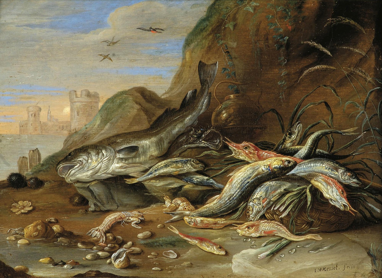 (A seashore with a still life of fish, crustaceans and other sea creatures)