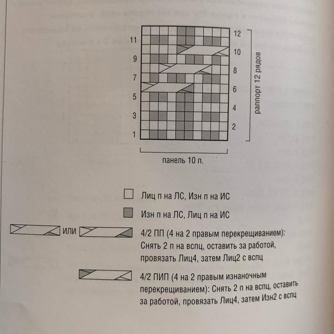 На рисунке -схема вязания узоров, раппорт каждого выделен зеленым цветом. Более мелкий узор (для спинки, рукавов и между широкими жгутами) имеет раппорт девять петель и четыре ряда.