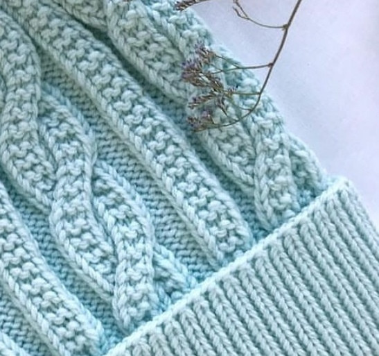 3р. В полоске, где платочная вязка 2 и 3 петли вместе, и убавку в перекрещивании в жгуте( те петли, что за работой-2 вместе)