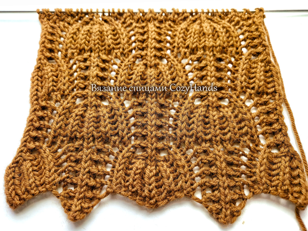 Количество петель кратно 13 + 5 + 2 кромочные петли. Набрать 20 петель (13 + 5 + 2 кромочные петли) и вязать по схеме. На схеме приведены только лицевые ряды. В изнаночных рядах все петли и накиды вязать изнаночными. Раппорт узора составляет 13 петель в ширину. Начинать с 1 кромочной петли, повторять раппорт узора по всей ширине, закончить 5 петлями после раппорта и 1 кромочной петлей. 2 петли провязать вместе лицевой протяжкой: снять 1 петлю как лицевую, 1 лицевая, протянуть снятую петлю через провязанную. Описание узора по рядам: |