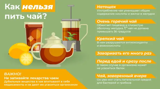 Нельзя пить обжигающий чай – он раздражает горло, пищевод, желудок. Если пить горячий чай постоянно, это приведет к болезненному изменению этих органов. Современные исследования свидетельствуют, что чай с температурой выше 62 градусов, принимаемый часто, обостряет ранимость стенок желудка и приводит к разным его заболеваниям. Чай не должен быть горячее 56 градусов.