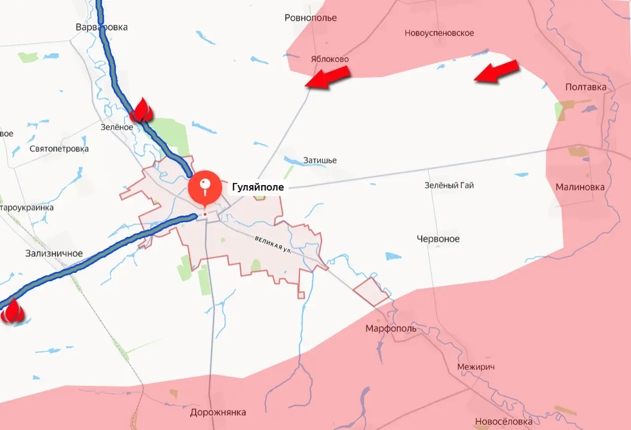 Продвинувшись западнее Яблоково, российская армия взяла под частичный контроль северный маршрут к Гуляйполю. И это при учёте того, что на его пересечении с рекой Янчур, в районе днепропетровской Даниловки, участок этой дороги (ведущей со стороны Покровского) уже под физическим контролем Вооружённых сил России.