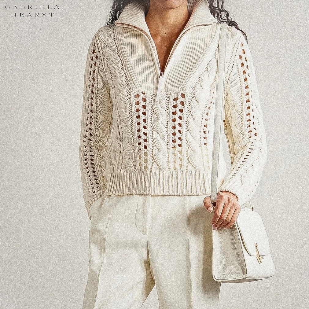 Эта модель — сочетание классики и спортивных элементов. Модель сочетает крупные косы, ажурные дорожки и акцентный воротник-стойку на молнии, который даёт вариативность: расстегнуть как лацкан или застегнуть до верха.