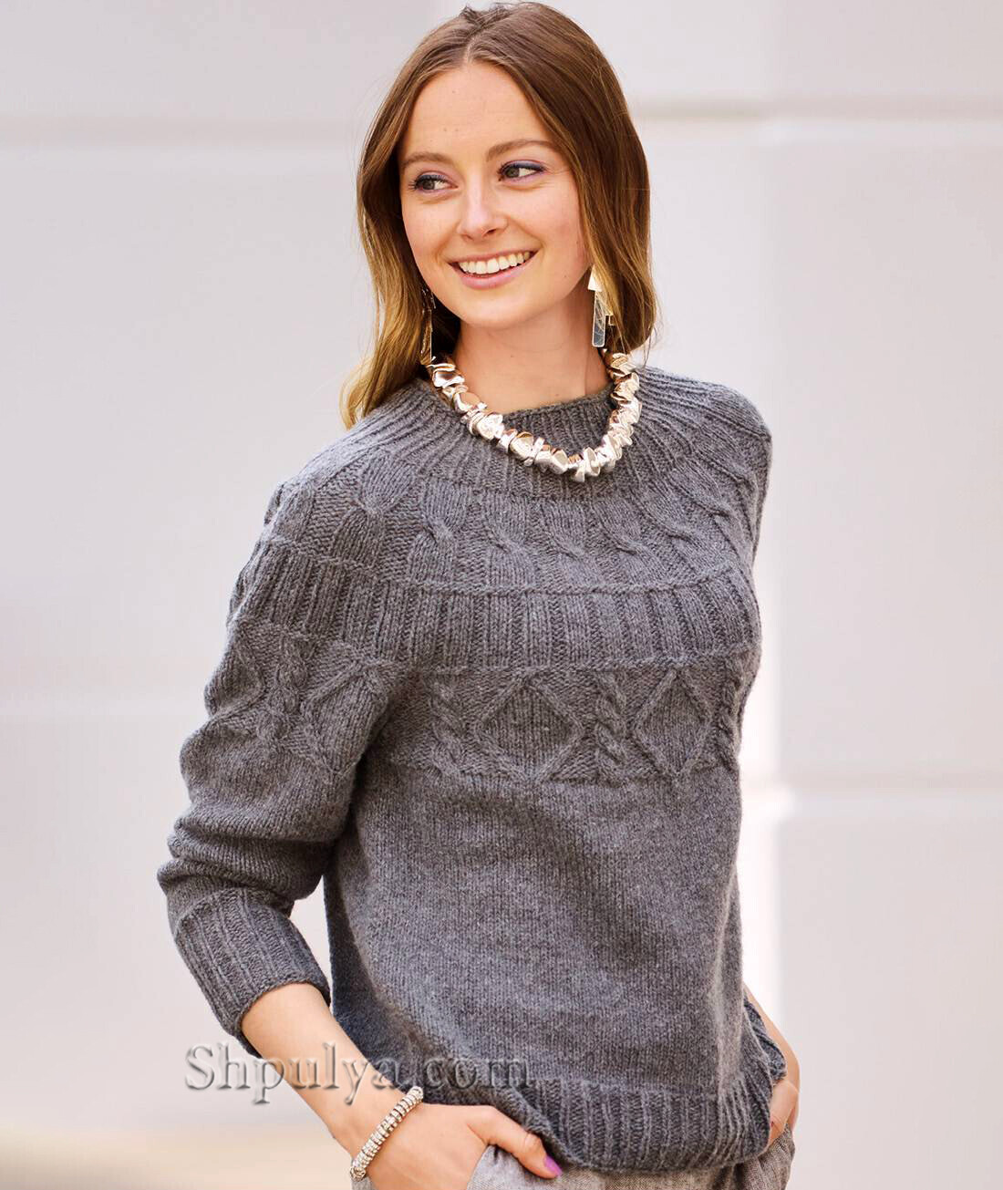 Вместо пестрого жаккарда — выразительный коллаж из «кос» и резинки, дополненный снизу ромбами. За счет неплотной вязки пуловер из чистошерстяной мериносовой пряжи получается очень легким.