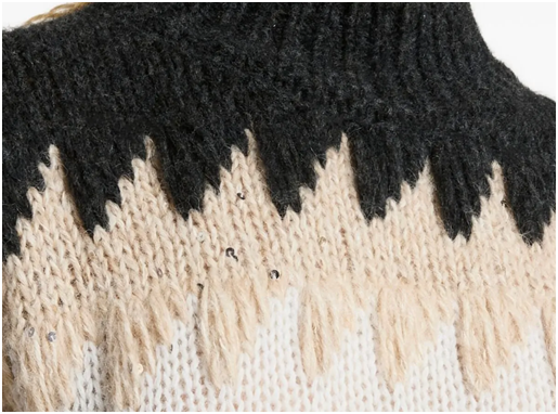 Джемпер выполнен в эффектном геометрическом дизайне с выразительным зигзагообразным узором. Модель сочетает в себе три цвета: чёрный, бежевый и белый, что создаёт динамичный и стильный контраст.